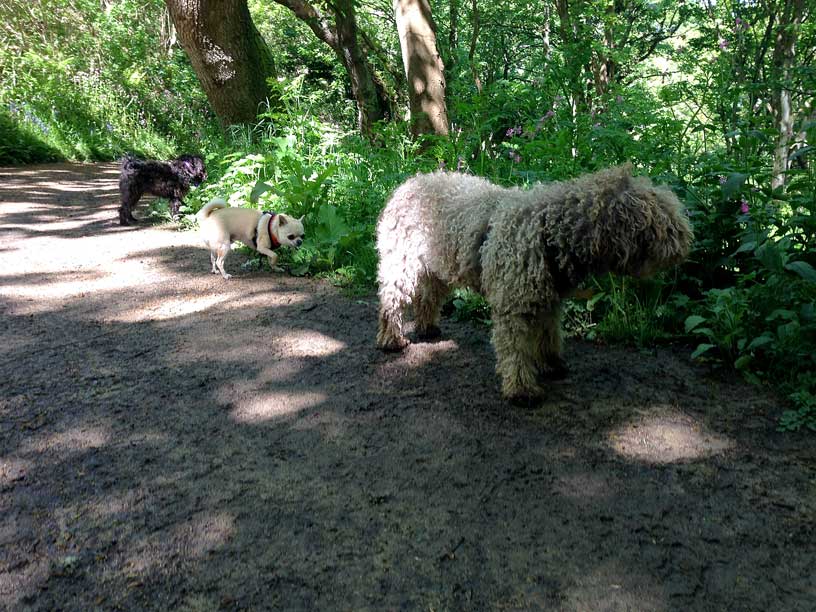 A cooling breeze swept up the slopes of the wood from the sea below as strong sunlight penetrated the canopy casting a dappled patten on the floor stretching before us enticing us deeper into the wood, Woodpeckers drumming and the song of territorial songbirds staking that claim to their special peace of woodland provided the soundtrack to our walk. By this time the crew were dashing round trying to beat each other to the next sniff! We ventured to the valley floor where ferns and delicate mosses covered the ground next to the stream cascading over stones, down here this part of the wood has an enchanted feel about it with large stoney outcrops and stunted old oak trees covered with lichen. So much to take in you need your wits about you if you don't want to miss something, our walk was made extra special with Cuckoos seeking out foster parents in stealth mode, only given away by songbirds going completely nuts trying to prevent the cuckoo approaching.